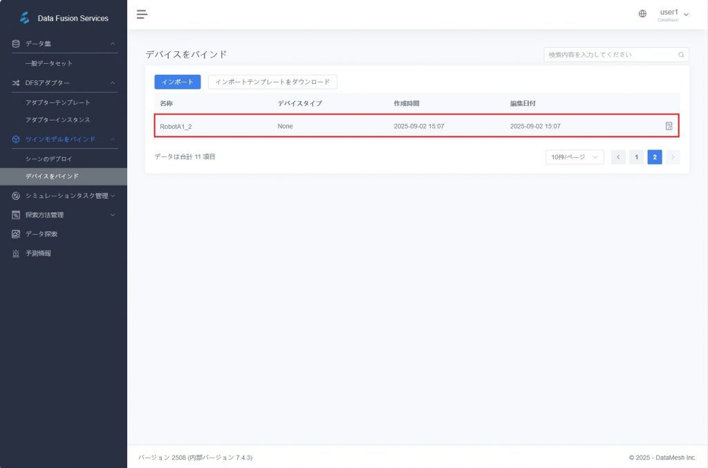 • 【ツインモデル関連】>【デバイスバインド】で、接続済みのロボットアームデバイスを選択します。