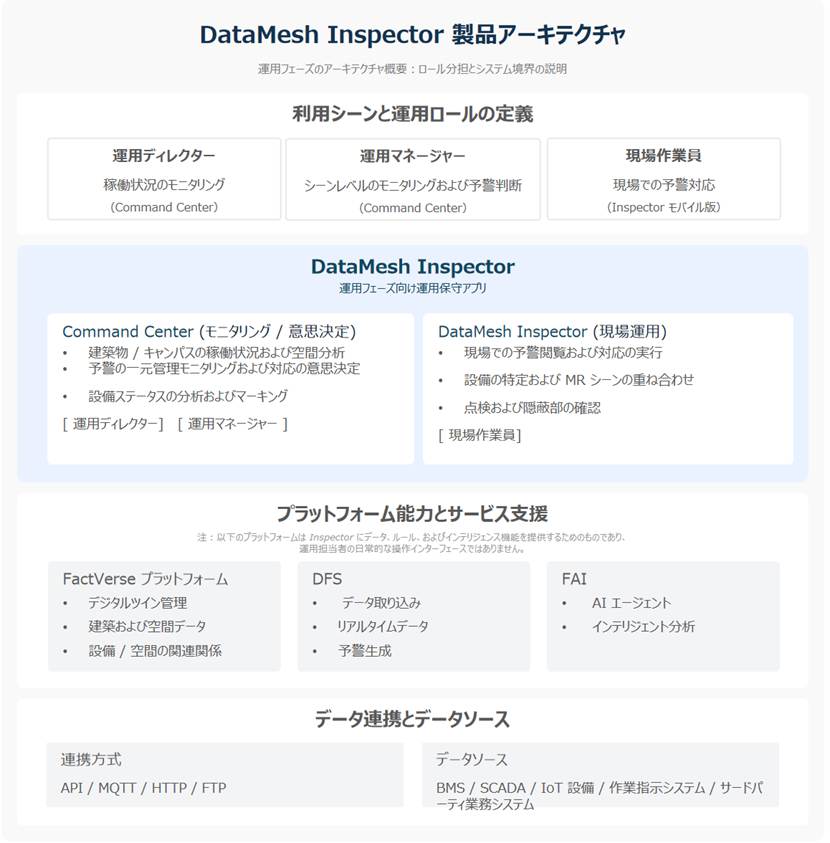 • DataMesh Inspector:本製品の全体名称を指します。FactVerse プラットフォームを基盤として構築された、デジタルツイン運用・メンテナンスアプリケーション体系を表します。