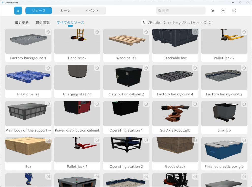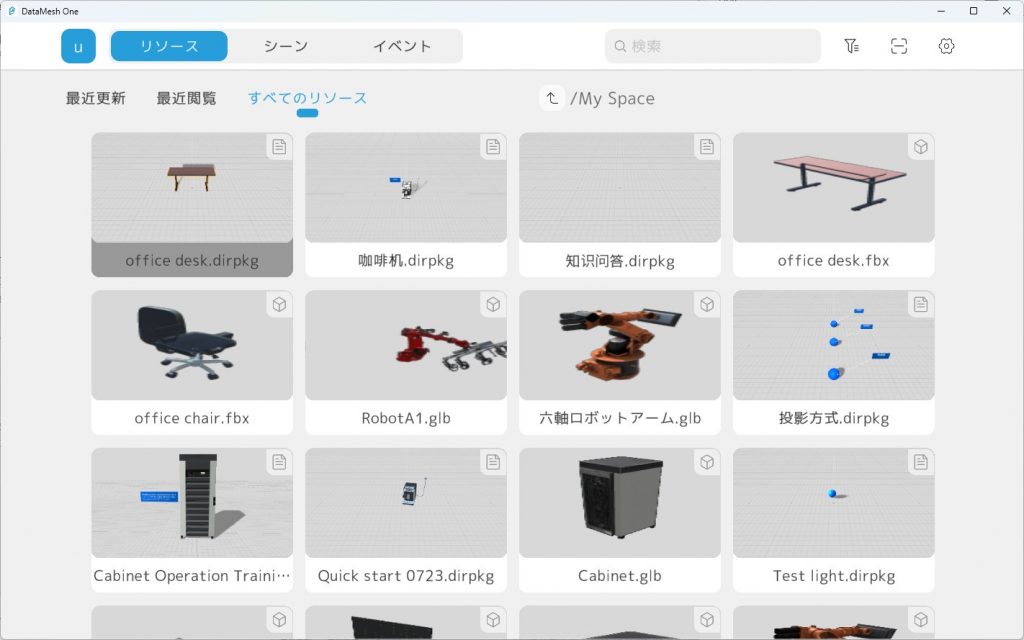 DataMesh Oneの標準モードでは、リソース画面を介して、3Dモデル、2Dリソース、シナリオなど、さまざまなタイプのリソースを開くことができます 。