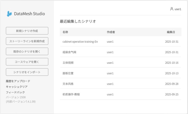 - ローカルのシナリオを開く:「シナリオをインポート」をクリックして、ローカルに保存されたシナリオファイル(拡張子 .dirpkg)を DataMesh Studio にインポートできます。