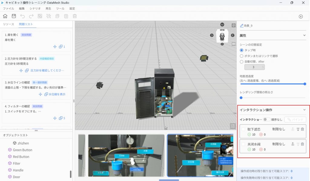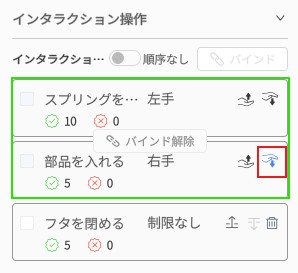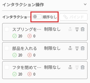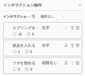 作成が完了すると、シーンの[プロパティ]パネルに「インタラクション操作リスト」が表示されます。具体的な操作手順については、「インタラクション操作問題の編集」チャプターをご参照ください。