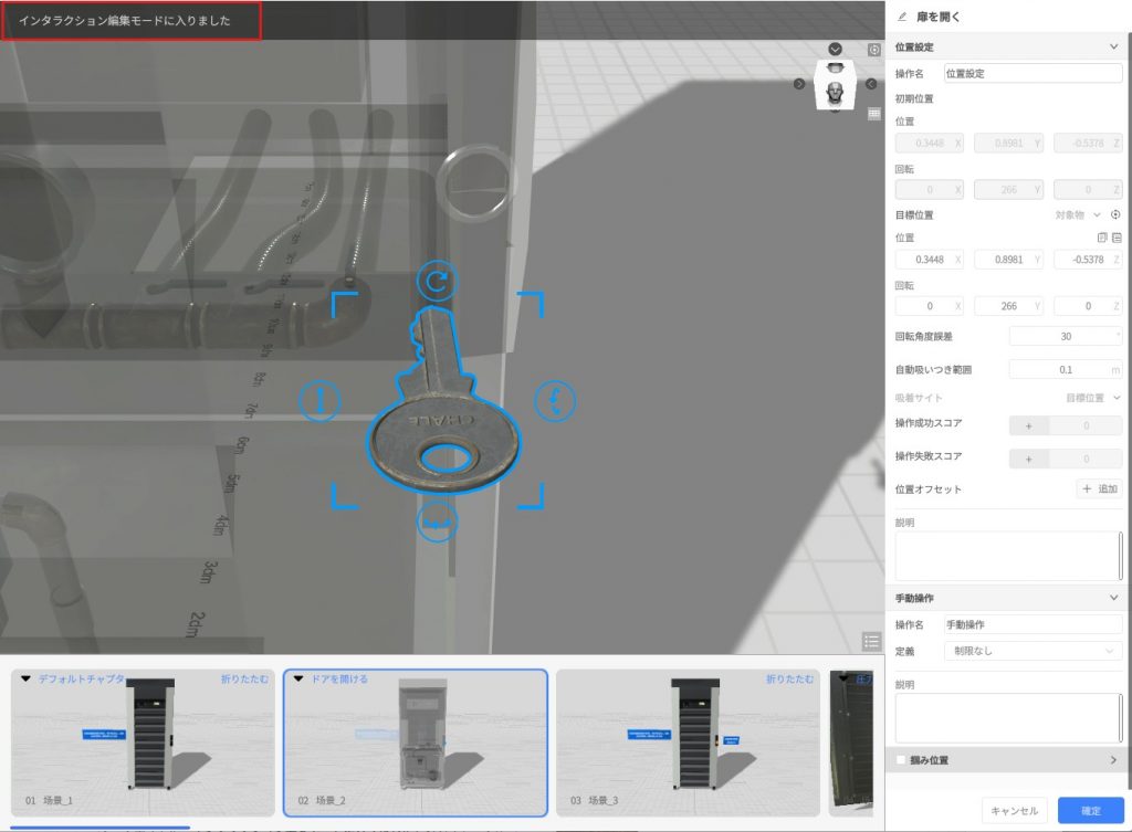 このボタンをクリックするとインタラクション編集モードに入り、選択したモデルに対して、目標位置や回転角度などのインタラクション操作を設定できます。