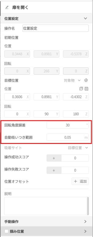 - 回転誤差角度の設定:手でモデルを掴む際に許容される回転角度の誤差(単位:°)を設定します。
