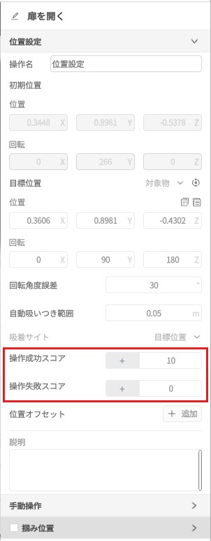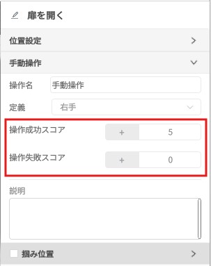 - 操作成功得点: 目標掴み点と角度誤差範囲内で掴みが成功した場合に得られる得点;