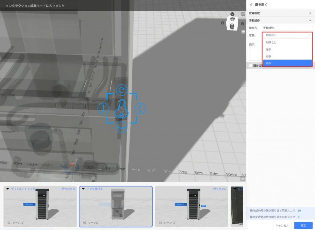 - シーン内で2つのインタラクション操作を作成し、それぞれの操作に 「左手」 と 「右手」 を設定、または両方とも「制限なし」に設定します。