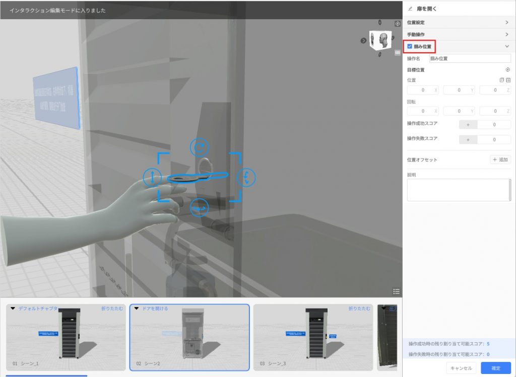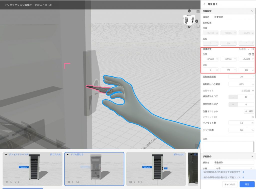- 設定の保存:【確認】ボタンをクリックして掴み位置設定を保存します。インタラクション編集モードを終了すると、手のモデルはシーン上で自動的に非表示になります。