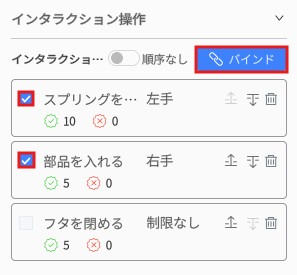 - シーンのプロパティパネルで、2つの操作の前にあるチェックボックスをオンにしてから【バインド】ボタンをクリックします。
