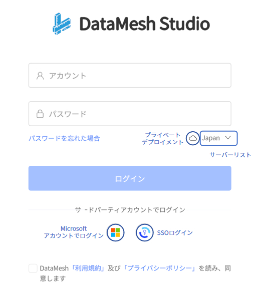 3. 利用規約に同意する:「DataMesh「利用規約」及び「プライバシーポリシー」を読み、同意します」をチェックして、「ログイン」ボタンをクリックします。