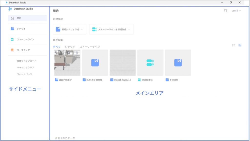 メインエリア(右側) | 現在選択されているモジュールの操作メニューやコンテンツ一覧を表示します。例:シナリオの新規作成、ストーリーラインの新規作成、および最近編集したコンテンツのリストなど。 |