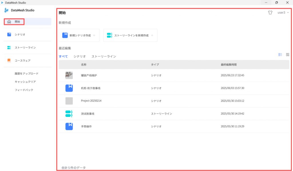 DataMesh Studio を起動すると、ホーム画面の「開始」ページがデフォルトで表示されます。ホーム画面は、主に以下のエリアで構成されています。