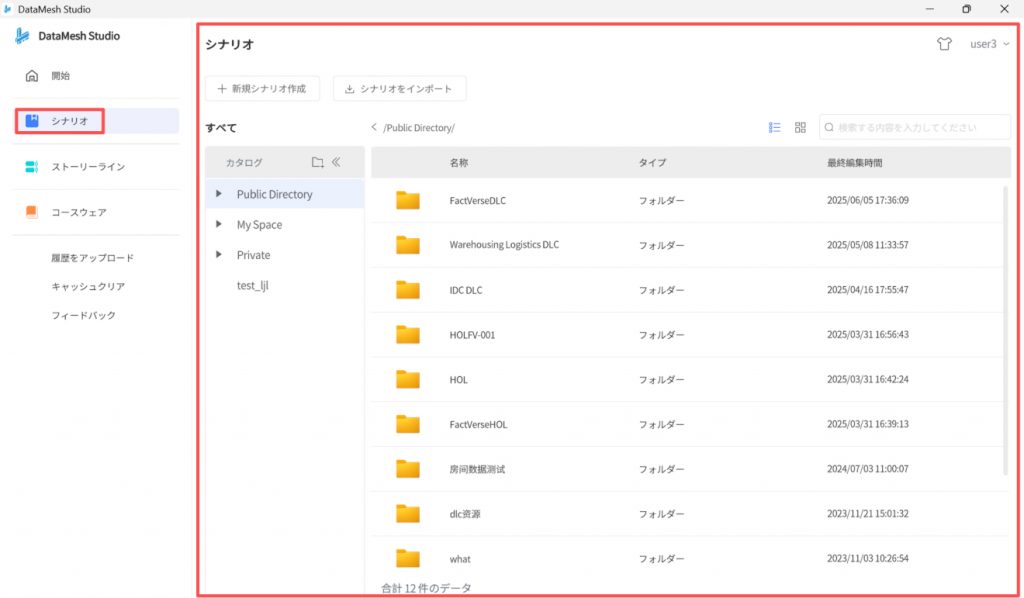 - シナリオ:すべてのユーザーに表示されます。アクセス権限のあるディレクトリ内のシナリオファイルの閲覧、検索、開くおよびインポートが可能です。