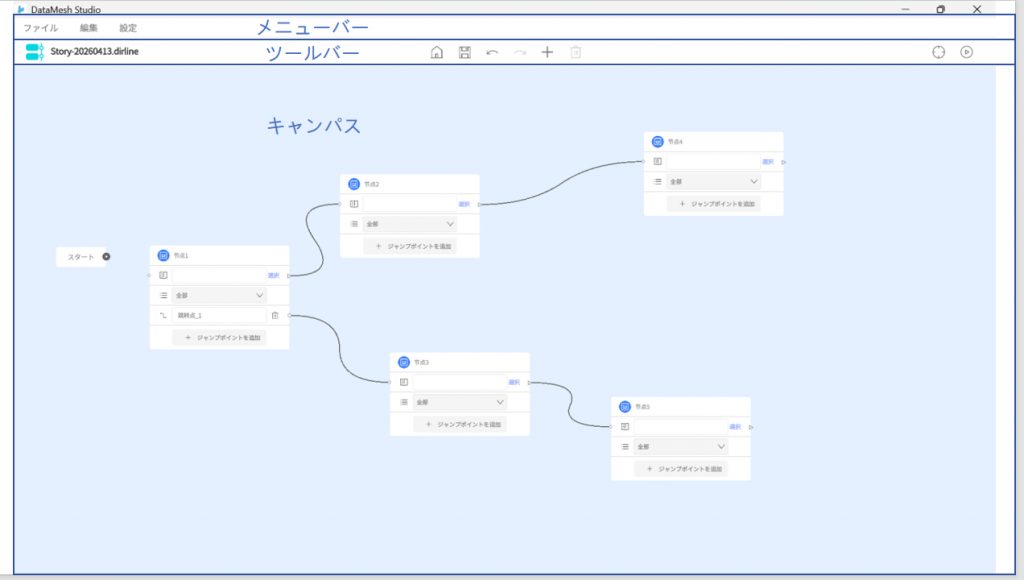 画面中央の広い領域がキャンバスです。ここでストーリーノードを追加・編集したり、ノード間の接続関係を作成したりできます。