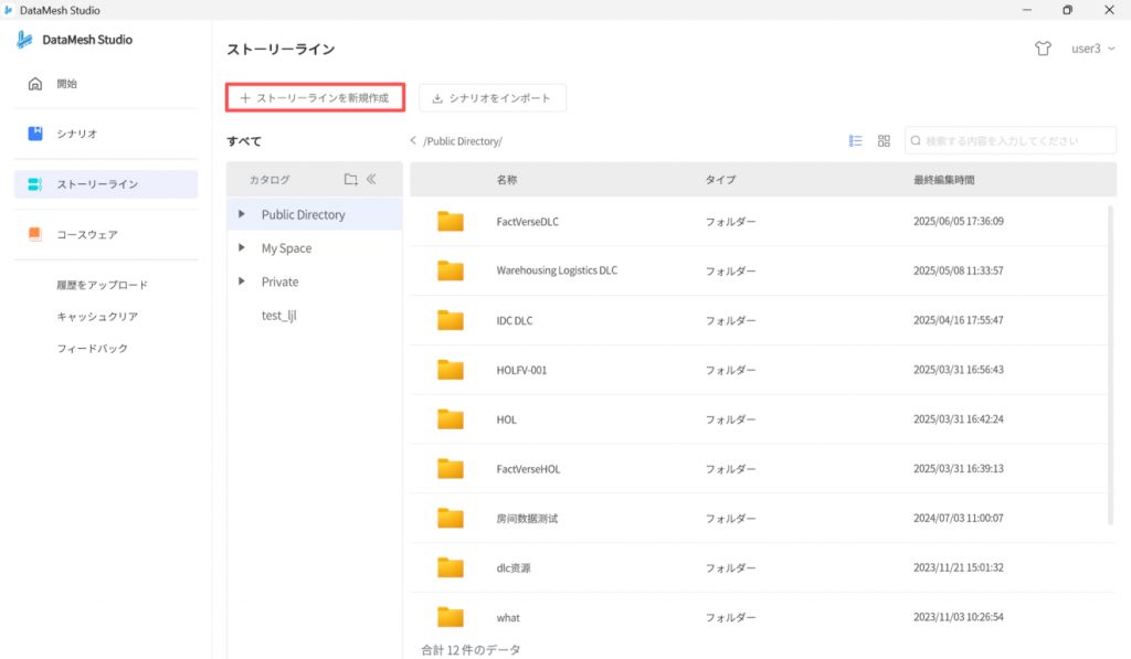 - ホーム画面の「ストーリーライン」画面にて、リソースディレクトリ内の対象フォルダを参照するか、上部の検索ボックスを使用して目的のストーリーラインを検索します。