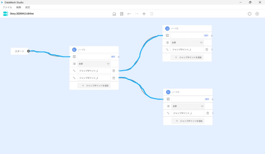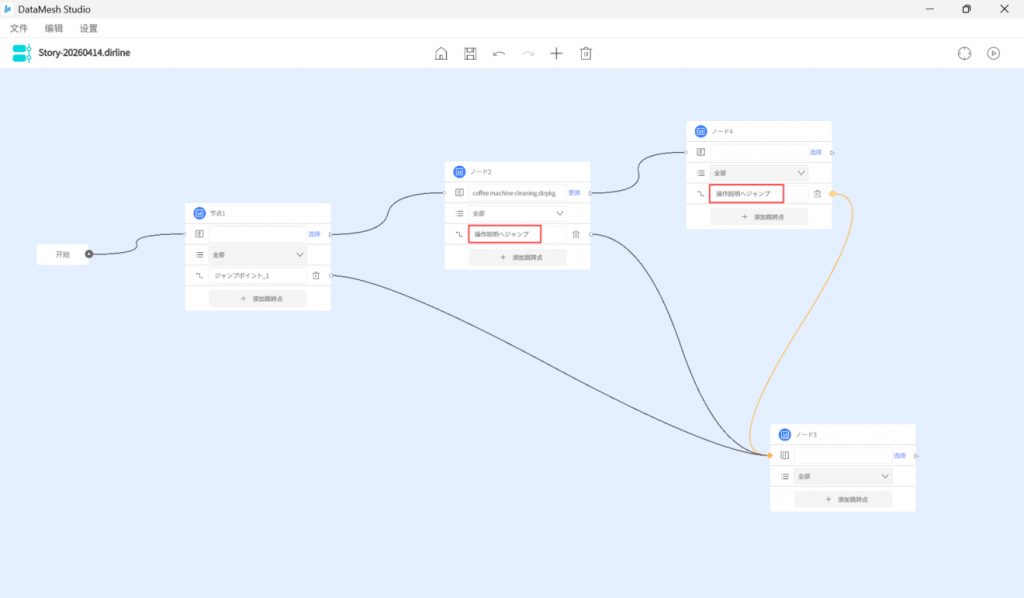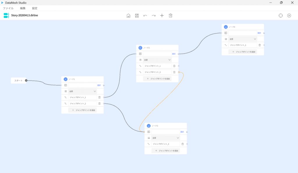 - ストーリーライン:複数のシナリオのシーンやチャプター間における再生・ジャンプ関係を定義するものです。ストーリーラインファイルは DataMesh One で再生可能で、チャプターの再生順序やジャンプロジックを制御します。