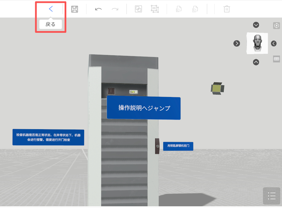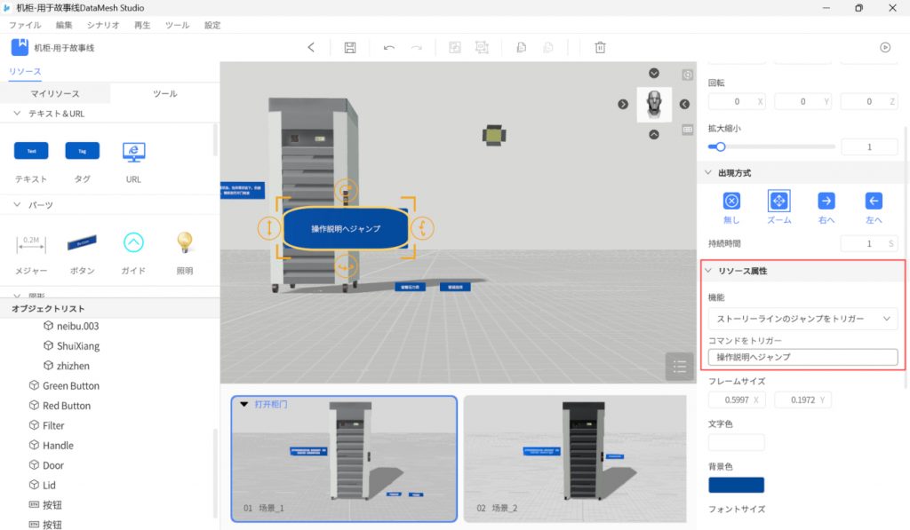 ※各ジャンプポイントは、1つのターゲットノードのみに接続可能です。ストーリーラインにバインドされたシナリオ内では、ジャンプポイントにトリガー命令を設定する必要があります。これらの命令により、ユーザーはモデルやボタンをクリックして、ストーリーライン内での戻る/ジャンプ操作を実現し、柔軟なナビゲーションやインタラクションが可能になります。