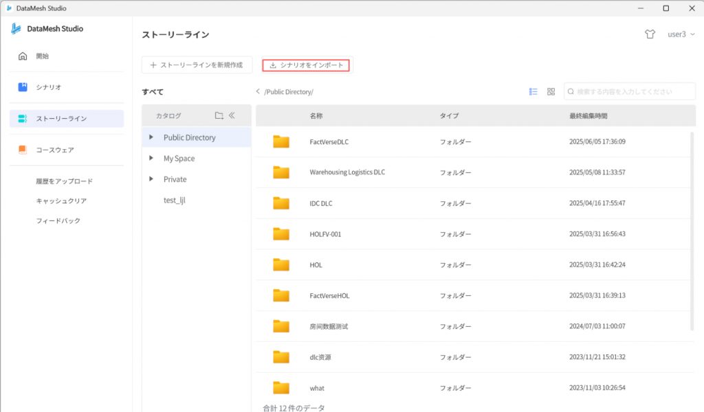 - ホーム画面の「ストーリーライン」画面にて、[インポート]ボタンをクリックします。